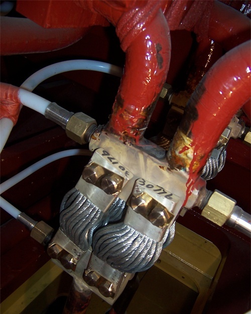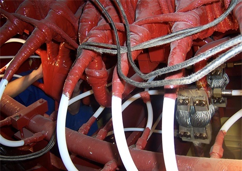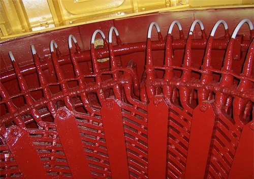 發(fā)電機(jī)下方的出線側(cè)連接螺絲都是純銅鍍銀的下方接封閉母線從發(fā)電機(jī)到變壓器的連接線都是封閉母線封閉母線會通正壓氣體,防止灰塵進(jìn)入這個銅塊很沉的這是發(fā)電機(jī)出線,絕緣包纏做絕緣之前是這個樣子的發(fā)電機(jī)的電流互感器安裝在藍(lán)色內(nèi)部白色的是純凈水管,用來冷卻發(fā)電機(jī)定子這是定子鐵芯和繞組。